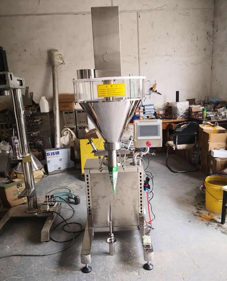 工作流程:人工套袋或人工放罐->容器升高一快速充填,同时容器下降-重量达到预量值-慢速充填-重量达到目标值-人工取出容器;